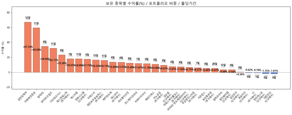 보유 종목이 너무 많아져서 글씨가 잘 보이지 않는다. 대충 느낌만 보면 될듯 하다. 오래 가져가는 종목은 2주 정도고 절반 정도가 3일 이하다.