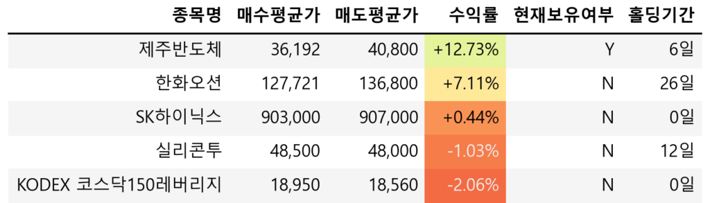 아침에 조선미녀의 미국 유통사 인수 소식에 급락했던 실리콘투를 재빠르게 매도하여 손실폭을 줄였다. 코스닥 레버리지를 시초가에 들어갔으나 약한 모습을 보여 매도했고 레버리지를 살거면 차라리 코스닥 반도체 레버리지를 쓰자는 생각으로 반도체 레버리지를 매수했다.