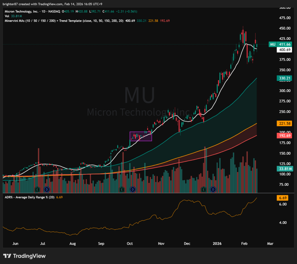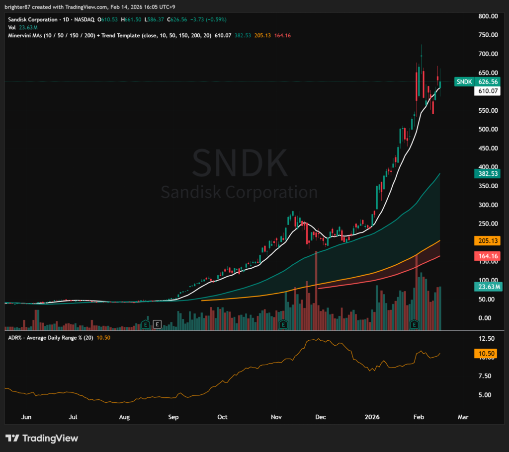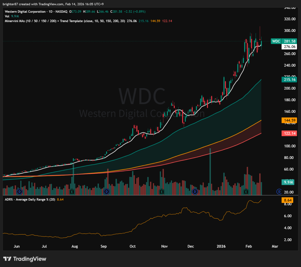 추세추종 전략에는 최악의 장세다. 횡보장인데다 변동성도 크다. 그런데 이러한 상황에도 일부 종목은 엄청난 시세를 보여주고 있다. 그중 대표적인 종목이 바로 메모리와 연관된 MU, SNDK, WDC와 같은 종목이다. 우리나라의 삼전과 하이닉스도 대단한 상승세지만 이들 종목의 상승세는 넘사다. 심지어 나스닥에서는 위에서 보듯 추세 자체가 없었다. 그런데 개별 종목 중 시장의 관심을 받은 종목은 엄청난 상승을 보여줬다. 아래 세 종목의 최근 1년 주가를 첨부한다.