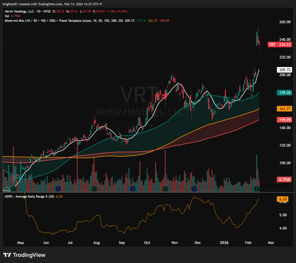 홀딩 종목 중 가장 마음에 드는 건 사실 VRT다. 차트적으로도 그렇고, 펀더멘털도 굉장히 좋다. 우주 데이터센터가 상용화되기 전까진 냉각 기술이 데이터센터의 핵심이다. 냉각 인프라를 모두 다루는 VRT의 주가가 좋을 수 밖에 없는 이유다. 아래 차트를 봐도 급등 후 기간 조정, 그리고 다시 신고가 재돌파라는 전형적인 상승 전 차트 패턴을 보이고 있다.