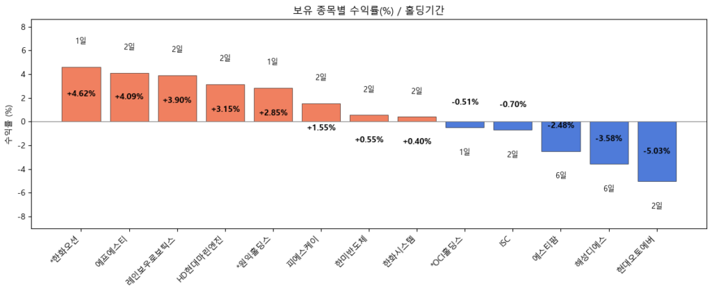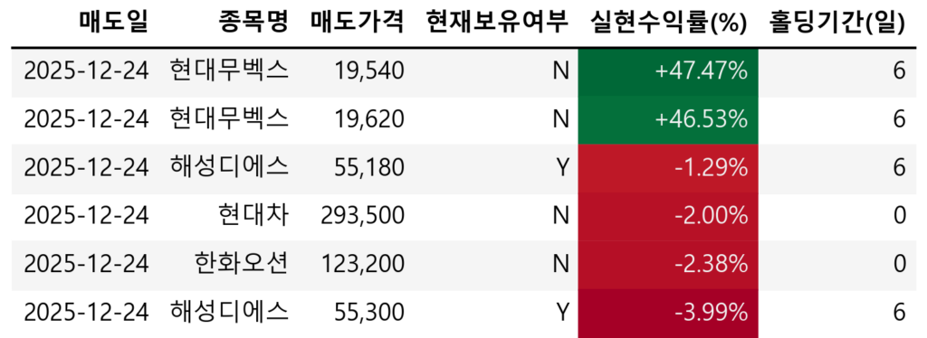 해성디에스 비중이 쓸데 없이 높아 초심으로 돌아가 1UNIT으로 변경했다. 한화오션과 현대차는 강세를 보며 0.5UNIT만 초기로 들어가고 나머지는 종가에 추가 매수를 고려하려 했으나 너무 밀려서 소량이기 때문에 우선 손절했다. 내일 크리스마스로 휴장일이기 때문에 오늘 종가 무렵 시장이 약할 수 있어 종가나 NXT에서 매수할까 한다. 현대무벡스는 20,000원 돌파 실패하는 것보고 적절히 매도했다.