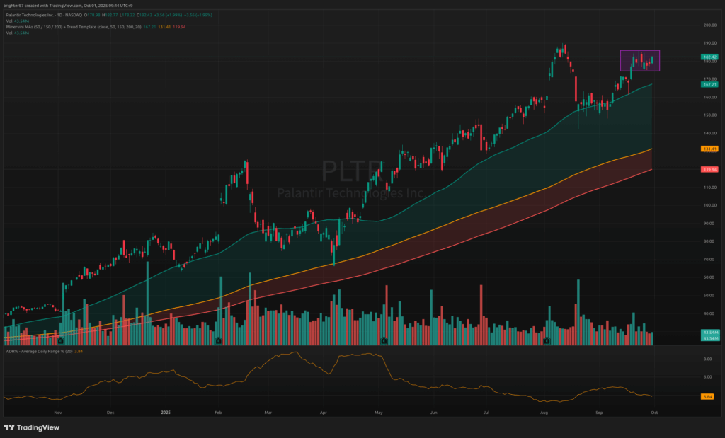 팔런티어. 누구나 아는 AI 관련주. 조정 이후 상승 중이나 매도세가 많아 횡보 중. 속임수 패턴. 박스권 돌파 시 매수 가능.