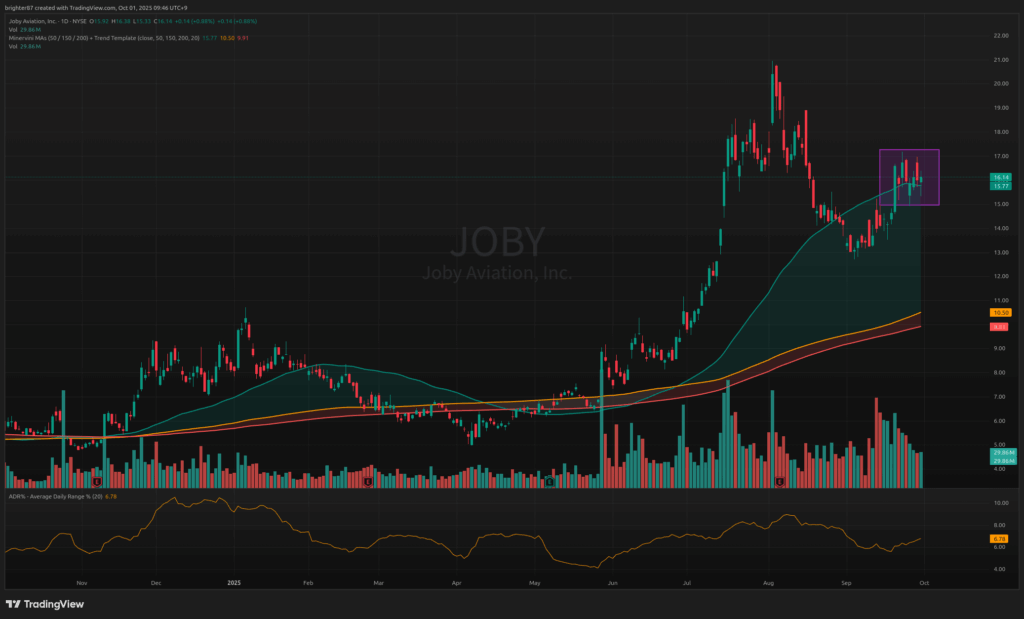 9/30 미국 주식 시장 종가 기준, 스크리너 통과 종목은 총 796종목. 이중 유의미한 거래량 $10,000,000 이상을 보인 종목만 선별했고, 그 중 베이스 돌파, VCP를 보이는 종목을 수작업으로 선별함.
