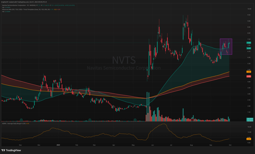 전력 반도체 팹리스 기업. 데이터센터의 전력 사용량이 급증하면서 관심이 증가. 최근 변동성이 컸으나 안정화되어가는 중. 박스권 돌파 시 매수 가능.