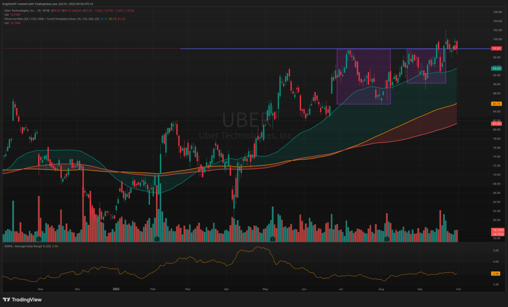 현재 홀딩 중인 UBER. VCP 돌파 패턴.