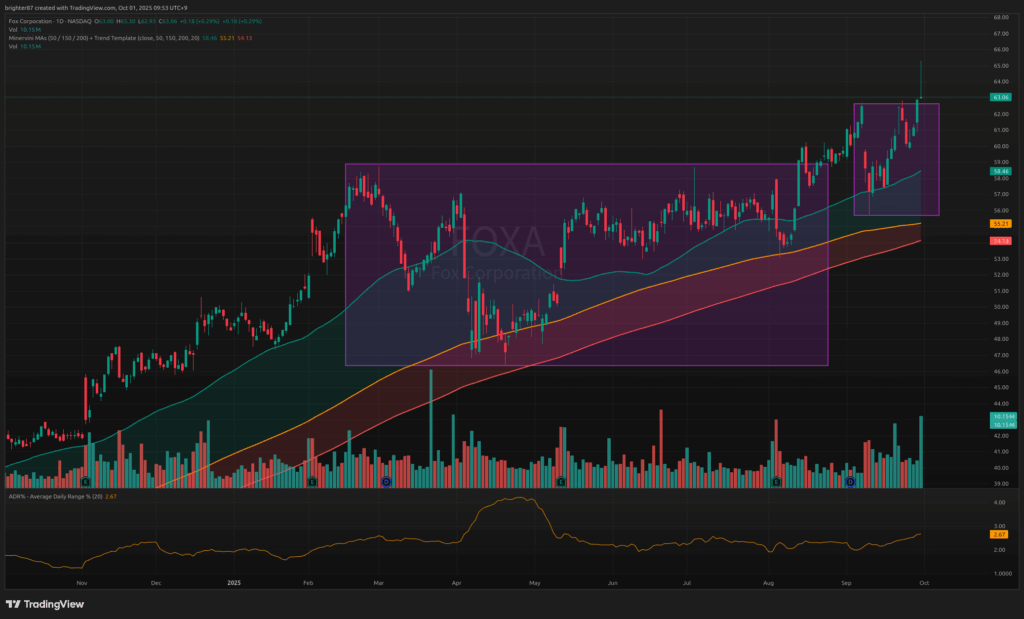 변동성 축소와 컵앤핸들 패턴. 상향 돌파. 차트만 보면 즉시 매수 가능한 종목. 그러나 시장이 주목하는 섹터가 아니라는 것이 약점. FOX ONE의 성공 여부가 주가 향방의 핵심.