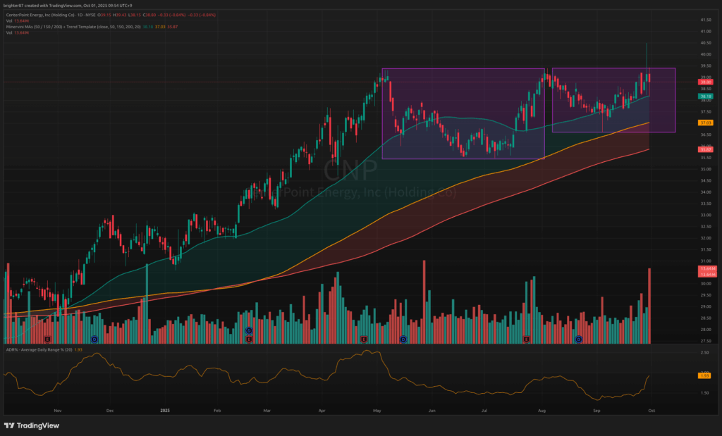 전력 및 천연가스 공급 비즈니스. VCP 패턴이지만 아직 완성되진 않음. 종가 기준 박스 밖에 위치해주는지가 관건. 시장이 좋아하는 테마이기 때문에 박스권 탈출하면 매수 가능.