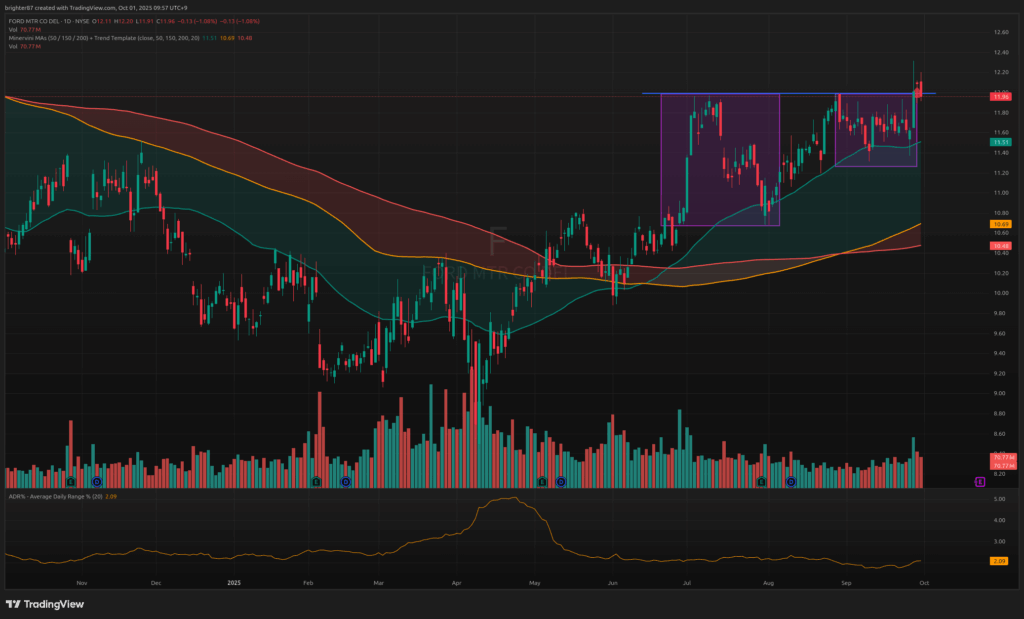 포드(F). 홀딩 중인 종목. 그러나 박스권 돌파 시도 실패에 매도 고려 중.