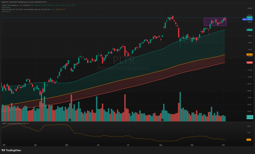 팔런티어. 변동성이 적기 때문에 큰 비중으로 투자 가능. 박스권 상향 돌파.