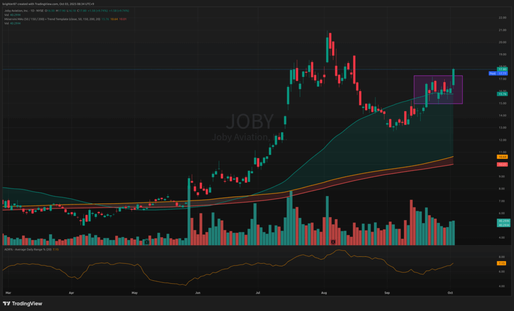 같은 패턴인데 문제는 대장주가 아니라는 것. 대장주는 ONDS로 이미 너무 올라서 매수할 수가 없음. 1등주가 하락할 때 2등주는 더 하락하기 때문에 논리상 JOBY를 매수하긴 꽤 부담스러운 상황.