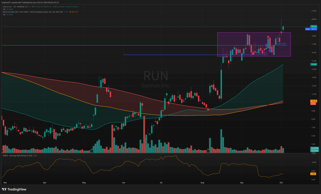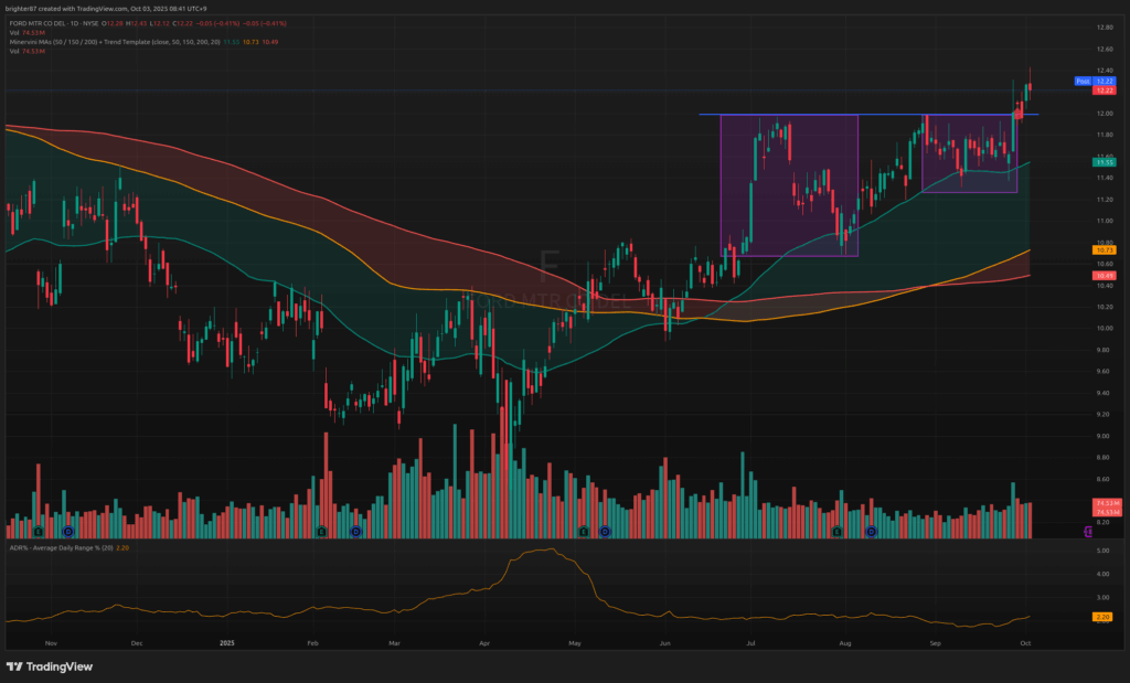 위 기준 중 1-7번 조건을 통과한 종목 중 차트를 하나씩 리뷰하여 8번 조건을 만족한 종목을 선정. 또한 조금 더 시장의 관심이 많은 종목을 고르기 위해 거래량 기준을 $10M 이상으로 제한 함.