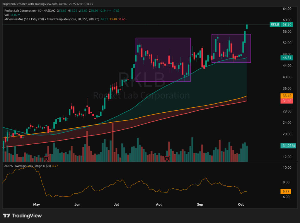 어제 PL은 살짝 조정 받았는데, RKLB은 박스권 탈출한 지 얼마 되지 않아 상승. 약간 박스권 상단에서 벗어나 하방 리스크가 있으나 당장 매수할 만한 수준이고, 조정 시 박스권 내로 다시 내려가지 않는다면 매우 좋은 매수 타이밍.