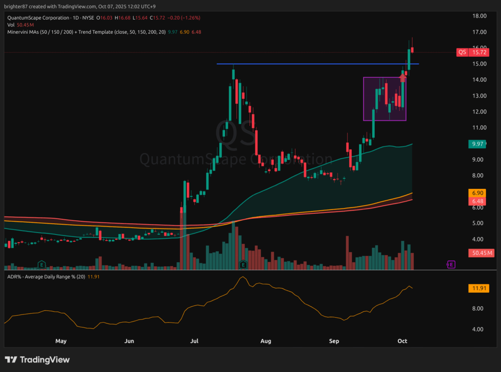 홀딩 중인 QS도 여전히 좋은 모습. 어제 SLDP가 급등하며 섹터 강세를 증명함. 섹터 강세가 유지된다면 차트가 더 좋은 QS가 더 오르지 않을까?