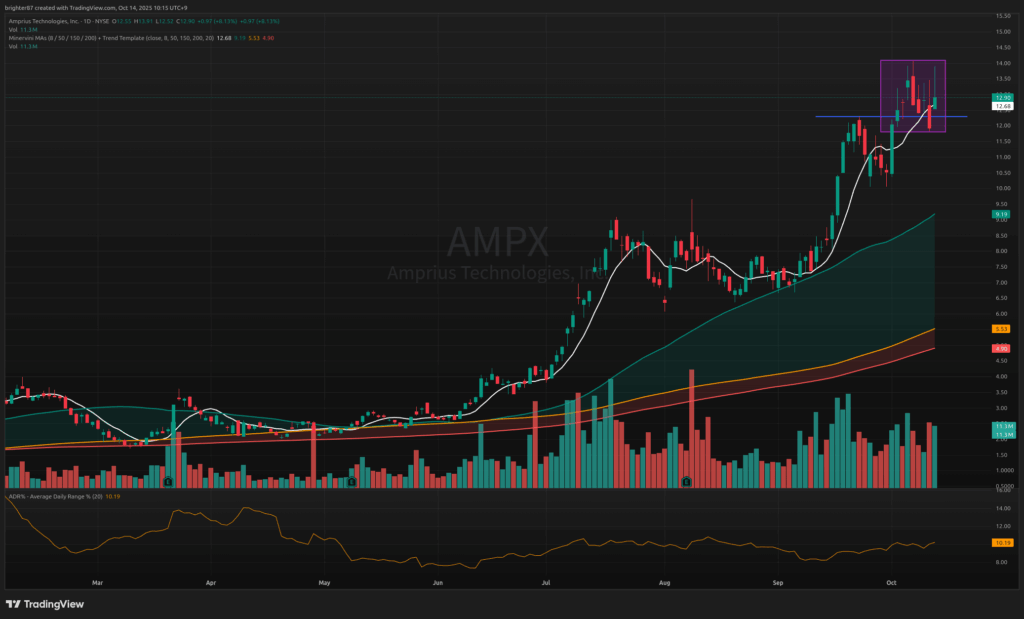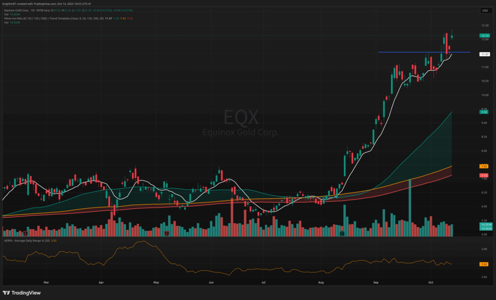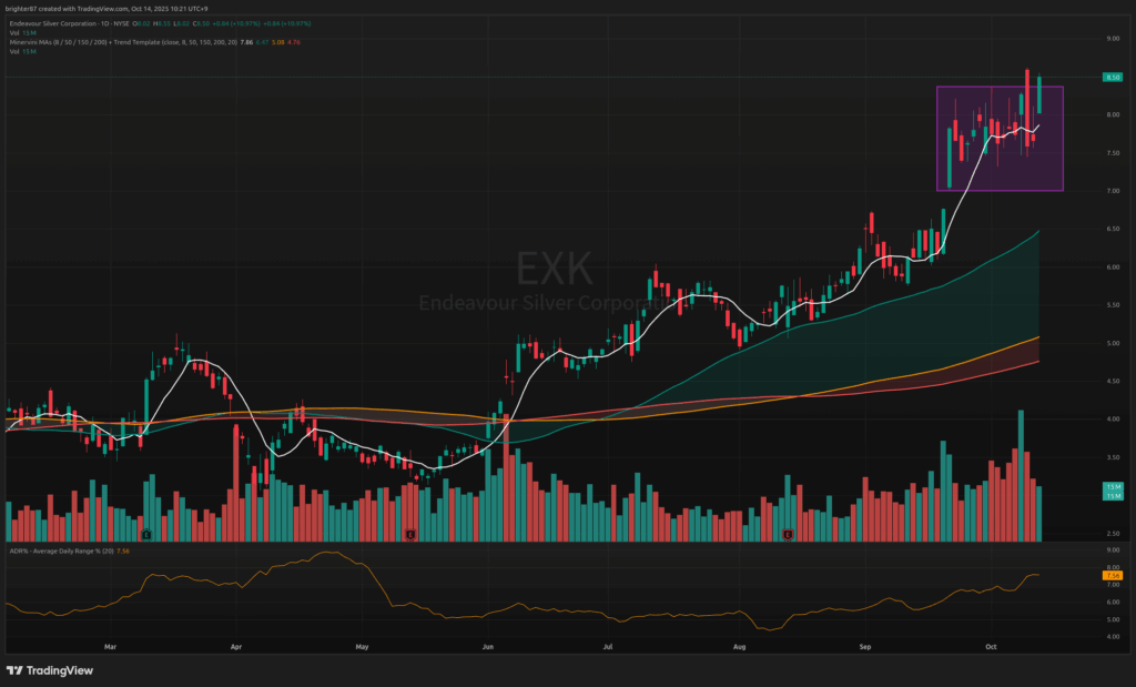 위 기준 중 1-7번 조건을 통과한 종목 중 차트를 하나씩 리뷰하여 8번 조건을 만족한 종목을 선정. 또한 조금 더 시장의 관심이 많은 종목을 고르기 위해 거래량 기준을 $10M 이상으로 제한 함.
