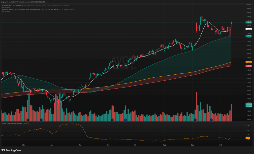 OpenAI의 칩을 만든다는 소식에 급등한 AVGO. 상승 -> 조정 -> 박스권 탈출의 전형적인 모습. 변동성이 적은 종목이므로, $350까지 하락했을 때 AVGX 같은 2배 ETF 매수가 가능할 것 같다.