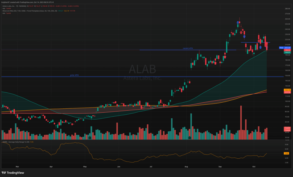 예전 기억이 좋아서 자꾸 매수하게 되는 ALAB. 실제로 펀더멘털도 좋은 기업이다. 9월의 조정 이후 반등하여 지지선 위에서 애매하게 거래됐다. 어제 지수 상승세에 지지선 근처에서 매수했다. 당일 기준 +6% 정도 상승할 때 프리마켓에서 매수했고, 장시작 후 밀리며 -3.61% 손절($207.98). 아쉬웠지만 종가는 그보다 훨씬 더 내렸다.($199.53)