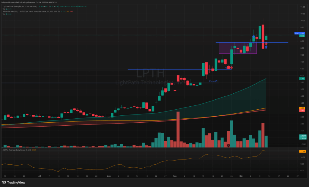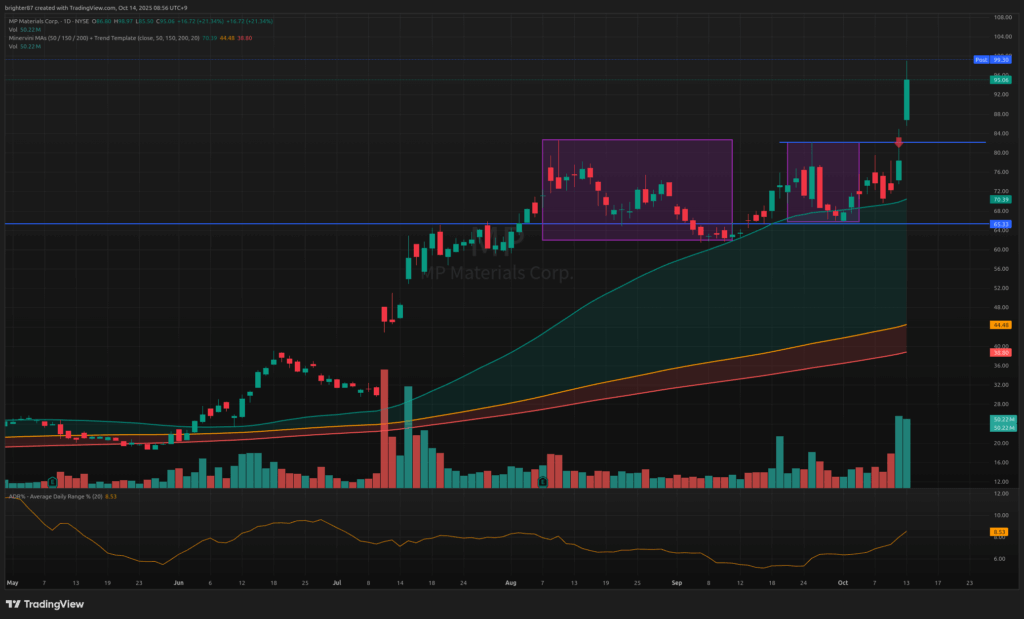 희토류는 강하다. 국장에서 희토류 종목도 매우 강한데, 미국 주식들도 강하다. MP도 위의 NVTS와 같은 예다. 박스권 횡보 후 강세장에서 시가가 박스권 돌파하며 시작. 그러나 MP 같은 경우 조금 먼저 지난 번 하락장에서 매수했다. 자기 혼자 상승하고 있었기 때문이기도 하고, 미중무역갈등이 지속되는 한 계속해서 상승할 수 있는 희토류 테마에 속한 종목이기 때문이다. 상승 흐름을 탓기 때문에 어떻게 흐르는지 지켜볼 계획. +15.12% 수익 중.