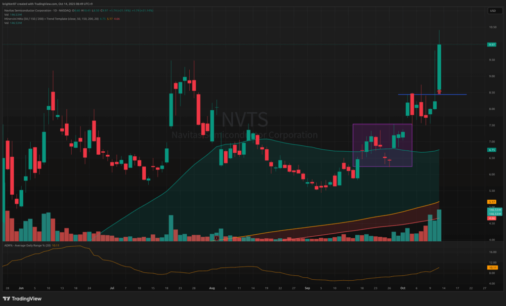 전력반도체 기업인 NVTS. 내가 가장 좋아하는 패턴이다. 상승 후 박스권 내에서 횡보하다가 어느 순간 박스권 위에서 출발하는 패턴. 이럴 때 장이 좋으면 박스권을 탈출하며 크게 급등한다. 매우 적절한 매수 시점. 현재 15.12% 수익 중이며 애프터마켓에서 엔비디아에 공급할 칩 개발 소식에 31.7% 추가 상승 중.