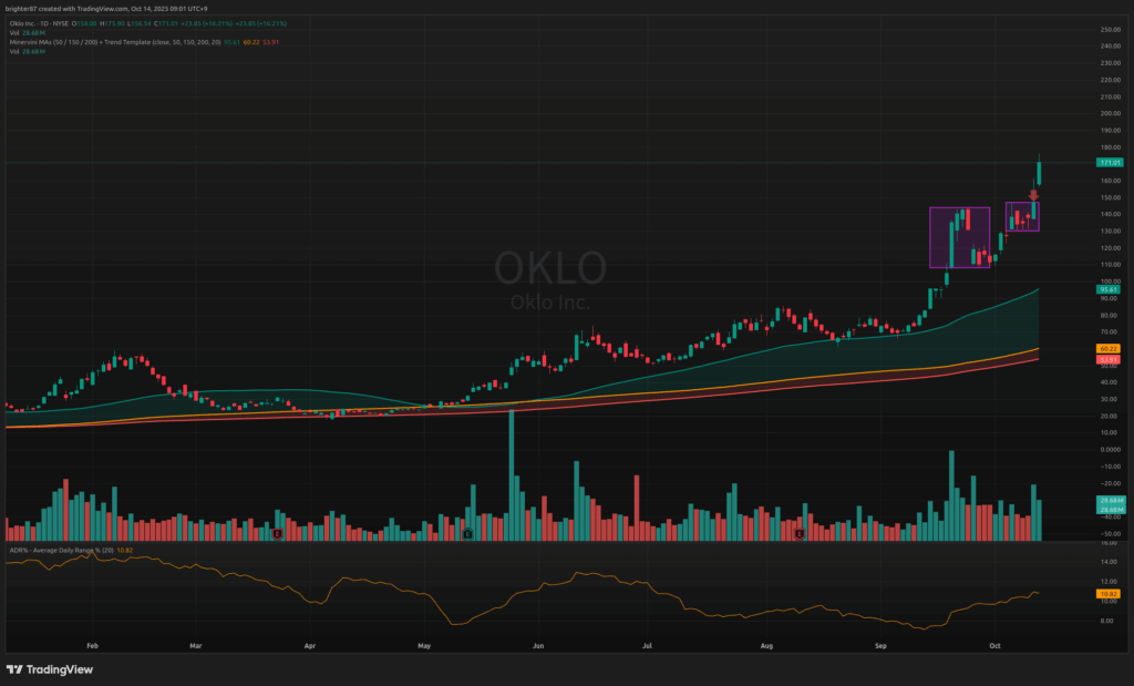 원전, 특히 SMR의 대장주 OKLO. 금요일 매수하여 홀딩 중. 박스권 상단에서 시가 형성되며 슈팅나오는 상황. 그러나 1년 간 너무 많이 올랐으므로 차익 실현 욕구 때문에 조정 시 다른 종목 대비 더 하락할 수 있다. 현재 +17.54% 수익 중.