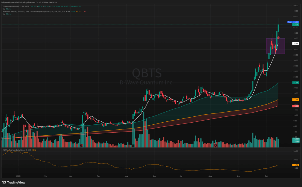 어제 미너비니 스크리닝 통과 종목으로 이야기했던 종목. 당일 반등을 예상하고 매수한 것은 아니다. 그러나 장 마감에 가까워지며 오를 종목은 올랐고, QBTS도 다행히 매수세가 꾸준히 유입되며 상승해주었다. 다만 펀더멘털이 취약한 기업이므로 약세장에서는 보다 빠르게 매도해야 할 것이다. 현재 +10.19% 수익 중.