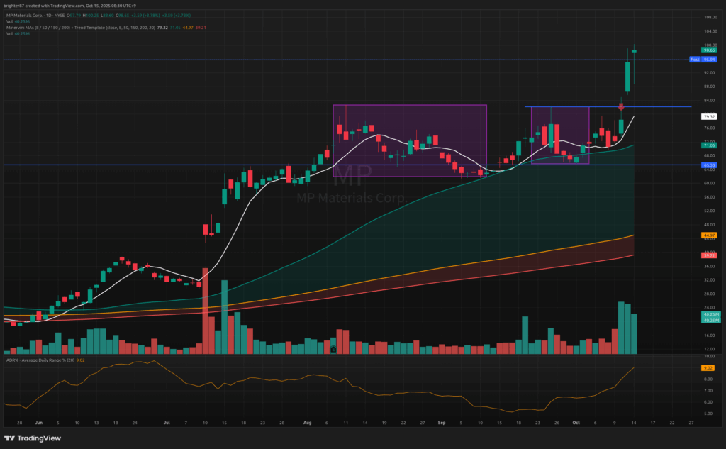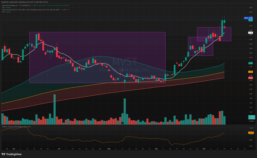 리튬이온 배터리 관련주로, 어제 밤 불타기를 진행했다. 박스권 돌파 후 박스권 상단까지 내려올 흐름이었기 때문이다. VCP 패턴으로 차트상 전형적인 미너비니 스타일 종목이다. 추가 매수로 수익률이 희석되어 현재 9.77% 수익 중이다.