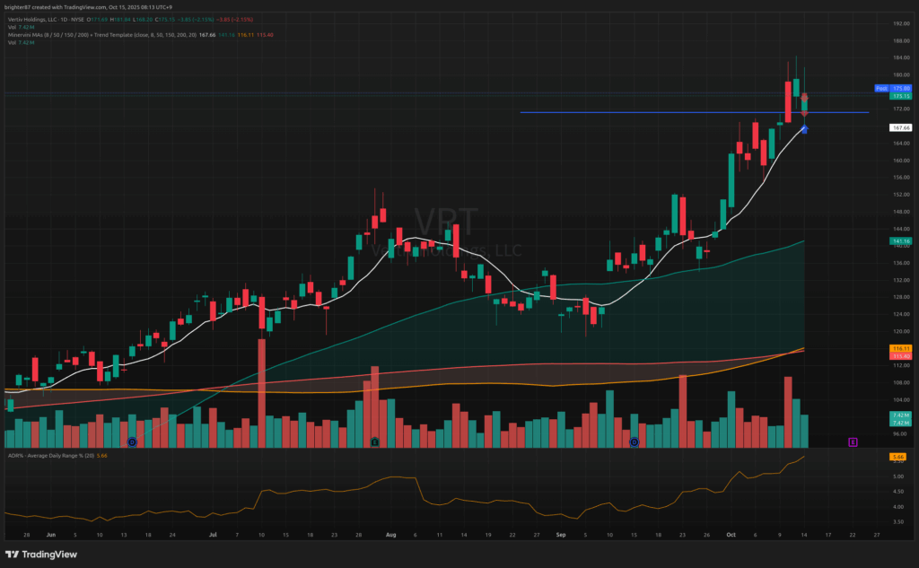 이 종목도 미너비니 스크리너 통과 종목. 위 차트를 자세히 보면 빨간색 화살표가 두개, 파란색이 하나다. 지지선 근처에서 매수하여 3% 정도로 스탑로스를 걸어뒀는데, 정확히 딱 그 레벨을 터치하고 올랐다. 펀더멘털이 매우 좋은 기업이고, 차트도 좋기 때문에 조금 더 넉넉한 손절을 설정했어야만 했다. 아무튼 반성하며, 더 높은 가격에 다시 매수했고, 현재는 홀딩 중이다. 현재 +0.40% 수익 중.
