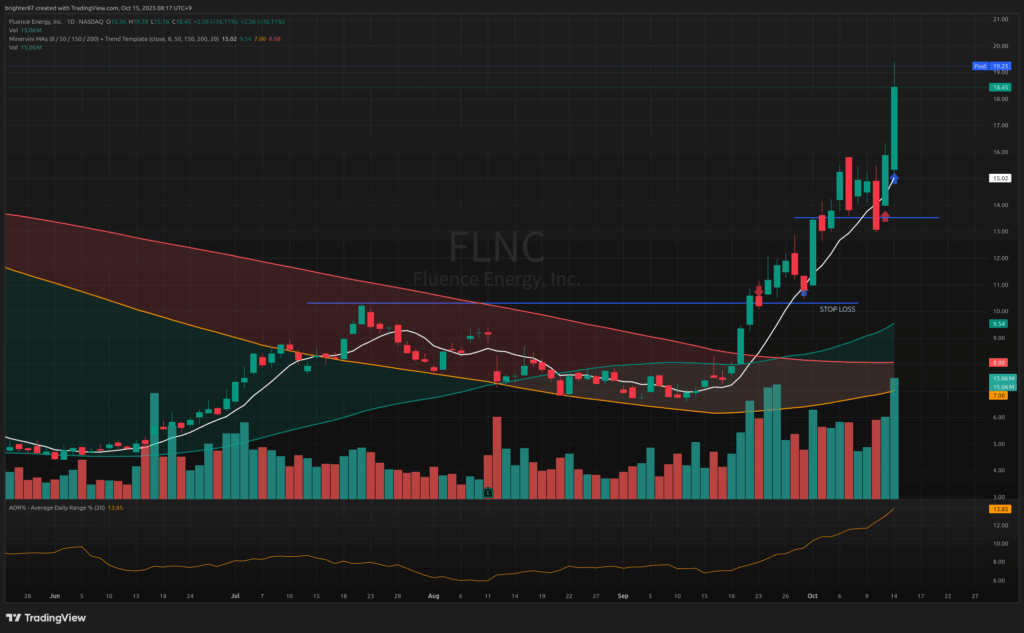 FLNC는 정말 화가 나는 종목. 근데 화를 낼 데도 없다. 내 잘못이기 때문에. 아직 상승기를 충분히 노리지 못한 상황이었다. 즉, 차트상 상승의 여지가 많은 종목. 펀더멘털도 좋고, 최근 미국산 배터리 수요 증가 테마로 테마도 맞는 종목이었다. 근데 어설프게 높은 스탑로스 설정으로 최저점에 익절 처리가 되었고, 결국 FLNC는 16.11% 상승 마감했다. 아쉽지만 다 내 잘못이다. +10.08% 익절.