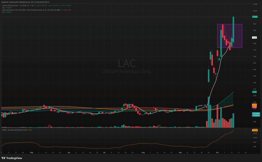 리튬 대장주가 된 것 같은 LAC. 최근 MP, TMC를 포함하여 미중 무역갈등 관련주들이 급등하고 있는데, LAC도 어제 박스권 상단을 돌파한 채 마감했다. 지금 $10.05도 -5% 손절 정도를 각오하면 매수 가능한 수준이나 오늘 상승폭이 너무 커서 단기 조정이 있을 수 있으며 $9.5 근처까지 하락했을 때 매수하는 것이 리스크가 더 낮아보인다.