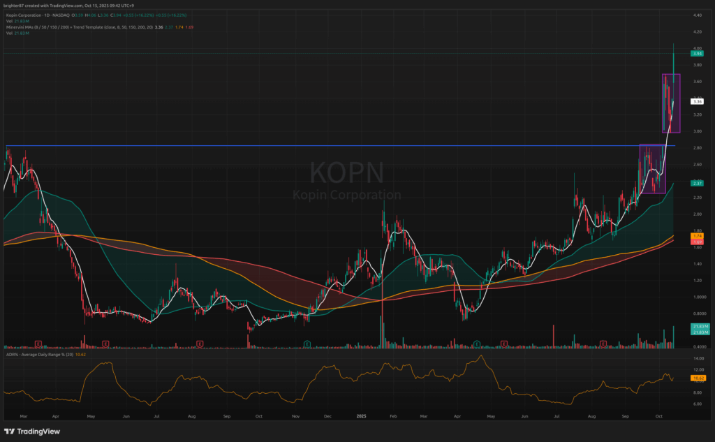 KOPN은 방산 관련된 microLED를 생산하는 기업. 최근 시장 트렌드에도 부합하고, 차트도 좋다. 박스권 상단 돌파했다. 단, 박스권 상단에서 약 7% 정도 이격이 있기 때문에 시장 상황 악화 시 -7% 근처의 하락은 쉽게 발생할 수 있고, 매출과 이익이 다소 불안정하므로 큰 비중으로 매수하기엔 어려워 보인다. 그러나 상승 흐름만 잘타면 큰 수익 줄 수 있는 종목이기 때문에 적절한 타이밍을 봐서 매수하거나, 아니면 놓아주어야 하는 종목이다.