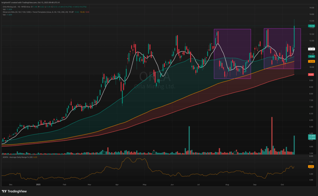 금 광산, 채굴 기업으로 매출과 이익이 꾸준히 상승 중이며 차트도 나쁘지 않은 기업이다. 문제는 어느 일정 수준까지 오르면 거의 항상 급락이 나왔다는 건데, 대주주 매도가 있었기 때문이다. 나름 수익성 있는 금 채굴 기업으로써 금 값 상승 트렌드에 편승하지 못하는 모습이 아쉽다. 그러나 이번엔 다를까? 만약 박스권 상단 위에서 한동안 머물러 준다면 매수해볼 수 있는 기업이다.