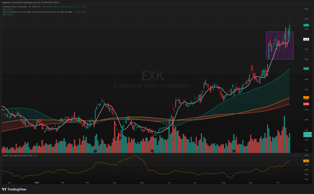 이틀 째 박스권 상단에서 유지해주고 있는 EXK. 충분히 매수 가능한 상태이지만, 3일 연속 상승으로 조정이 있을 수 있다. 다만 금, 은 테마가 생각보다 시장에서 큰 주목은 받지 못하고 있어 망설여지는데 조금 더 지켜볼 필요가 있다.