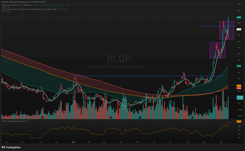목표가 상향으로 상승하는 BLDP(발라드파워). 박스권 상단 돌파에 4% 정도의 이격. 매수하기 적절한 시점이나 급등 후 매수세 확인이 필요한 구간. 테마도 매우 좋진 않음. 그러나 최근 상승세가 좋기 때문에 적은 비중으로 매수를 고려해볼 만 하다.
