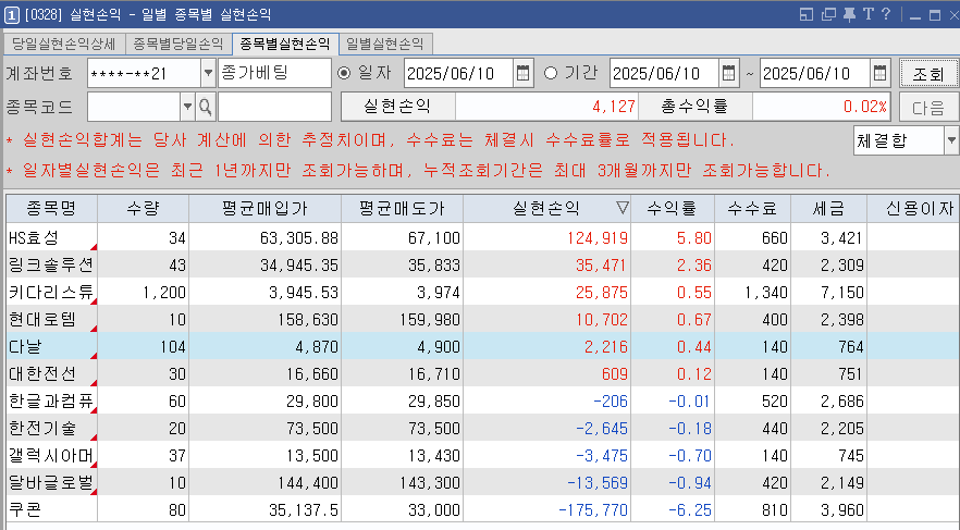HS효성 단기과열 해제 기대감 + 지주사 테마 강세. 잘 샀는데, 저점에서 매도… 키다리스튜디오 어제 웹튠 소식에 상승한 키다리스튜디오. 슈팅 안나와서 빠르게 익절하고, 어제 저점 지지 부근해서 재매수, 소액 추가 수익 실현. 달바글로벌 수출입데이터 앞두고 기관의 매수 연속성에 매매. -1% 손절. 한글과컴퓨터 AI 정책 기대감에 매수, 안가서 -0.01% 손절. 어제 저녁 기회줄 때 수익 챙겼어야 함. … 더 읽기