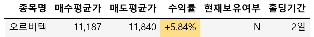 오르비텍은 미국의 원전주가 강세를 보여 연속성이 있을 것으로 보고 종가베팅한 종목이다. -2~-3% 정도를 손절로 보고 있었고, 금요일 장초반 상승을 주면 상황을 보고 매도할 계획이었다. 12,000원을 돌파하여 상승해주는 듯 하더니 다시 밀려 내려와 적절히 매도하여 익절했다.