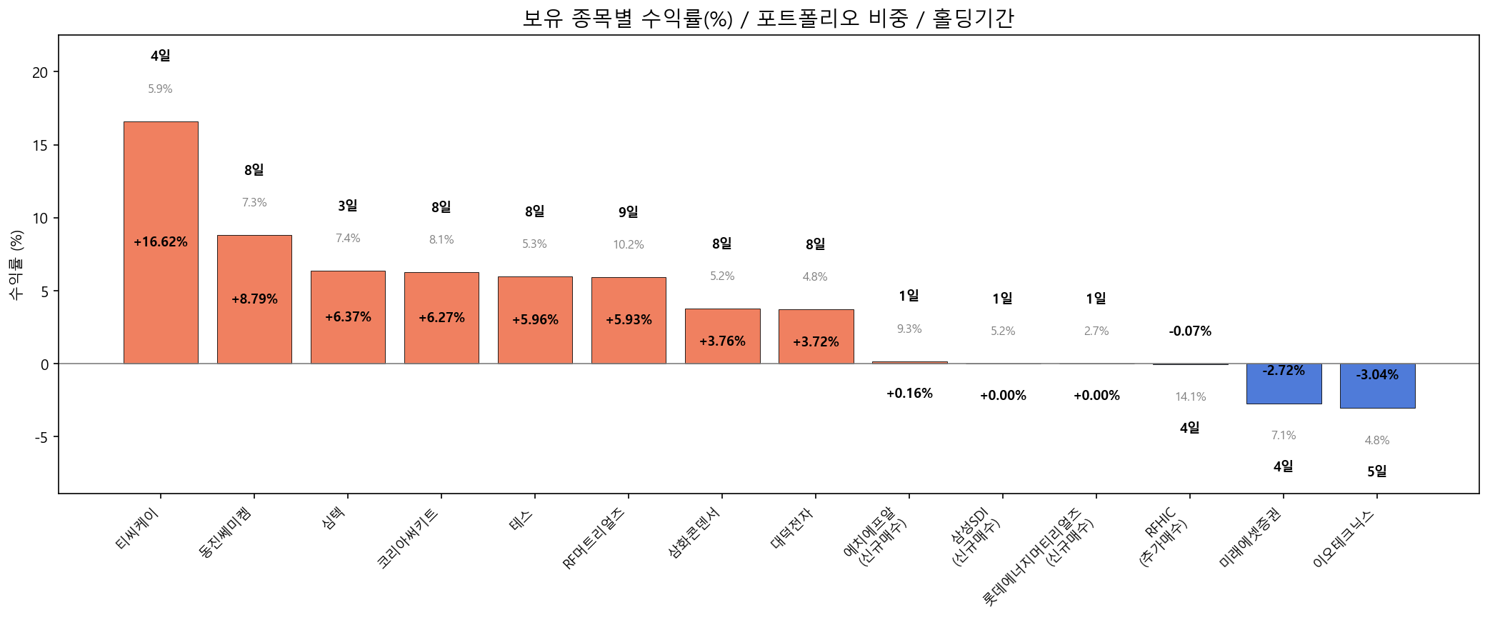 삼성전자의 낸드 증설 소식에 매수했던 티씨케이가 가장 좋은 수익률을 보이고 있다. 통신주들은 내게 가장 큰 수익을 안겨준 종목이지만, 요즘엔 많이 오른 주가로 종가베팅 개념으로 접근하다보니 당장 표시되는 평가수익률은 그다지 높진 않다.