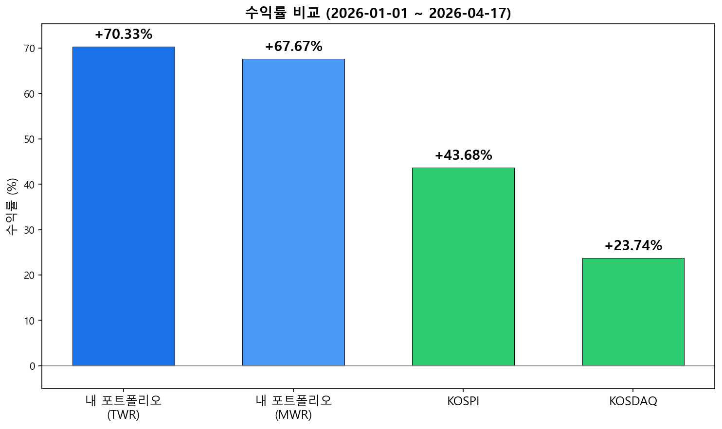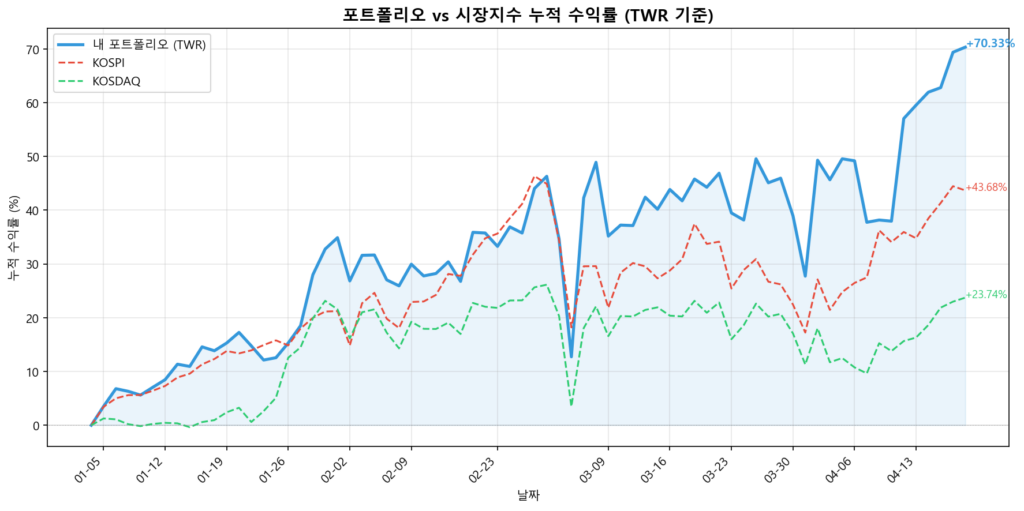 종가베팅이 성공함에 따라 포트폴리오 수익률은 70%를 넘어섰다. 진짜 살면서 처음 경험하는 높은 포트폴리오 수익률이다. 개별 종목에서는 좋은 수익을 기록해온 적이 있지만 포트폴리오 전체론 이렇게 좋은 수익을 기록하는 건 어색하다. 이런 수익을 볼 때마다 내가 나아가는 방향이 맞다는 생각이 강력하게 든다. 지금처럼 잘해보자~!!
