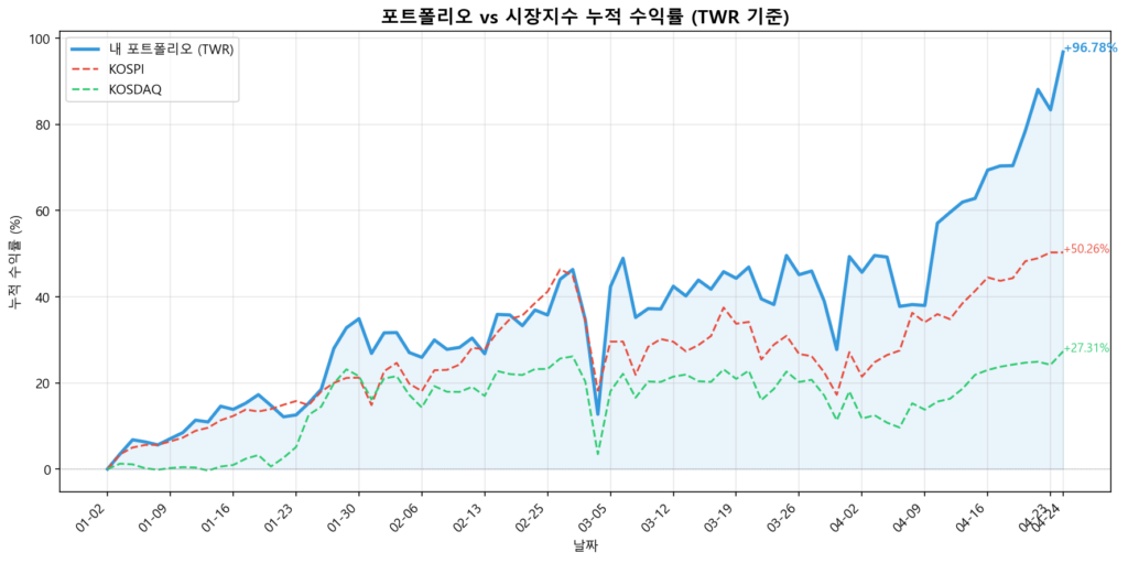 올해의 반도 지나지 않은 4월, YTD 기준으로 포트폴리오가 +96%의 수익을 기록하며 내가 느끼고 경험한 것을 정리해보는 글을 오늘 정리해 보고자 한다. 올해 지금까지의 성공에 상당 부분 운이 작용했음을 너무나도 잘 알고 있다. 그러나 2025년에 장이 좋았음에도 큰 돈을 벌지 못한 것을 감안하면 엄청난 성장이 아닐 수 없다.