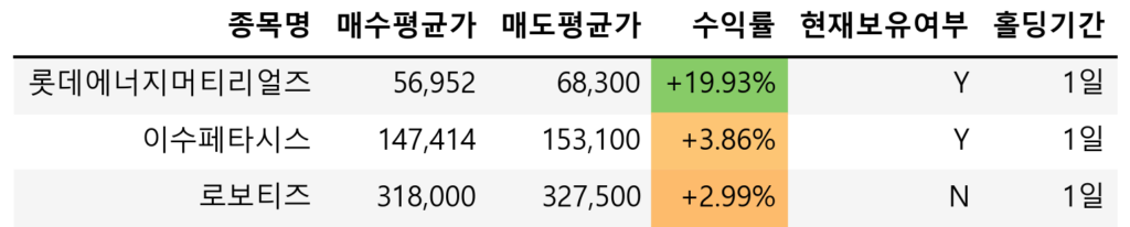 오늘 지독한 하락세를 보였던 이수페타시스와 로보티즈를 장 후반에 매도하였고, 어제 미장의 ESS 부문이 좋지 않았기 때문에 롯데에너지머트리얼즈를 1/3 정도 매도했다. 그러나 여전히 보유 종목 중 롯데에너지머트리얼즈가 비중 1위다.