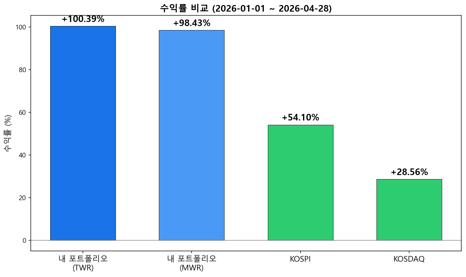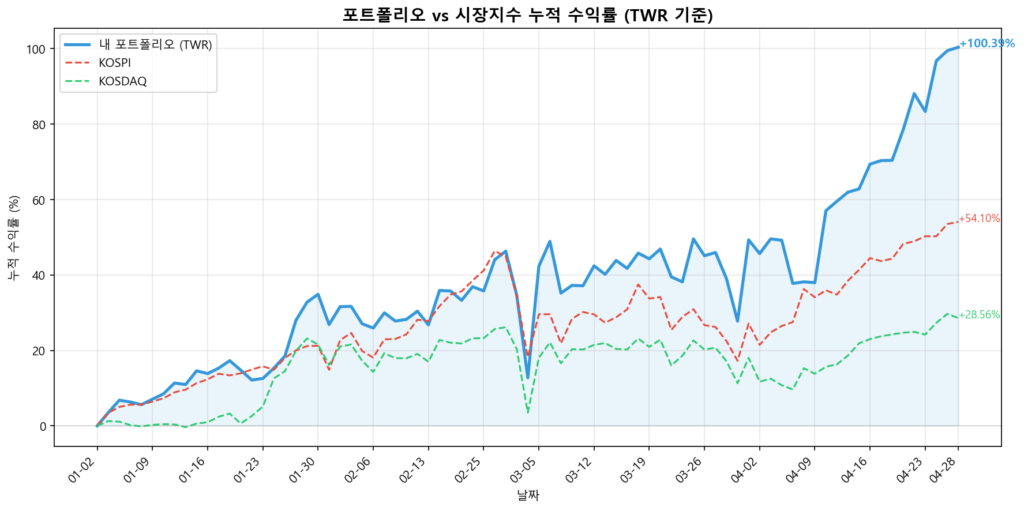 드디어 YTD +100%를 돌파했다. 지금이 꼭지일 수도 있으니 자중하자.